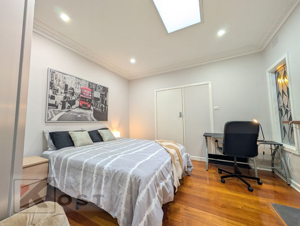 This extra large private bed room like the other bedrooms in this house is equipped with a queen size bed for comfort and a lock on the door for extra safety.